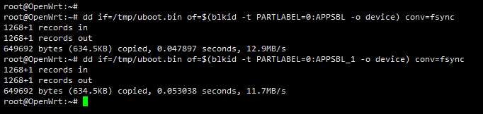 dd if=/tmp/uboot.bin of=$(blkid -t PARTLABEL=0:APPSBL -o device) conv=fsync