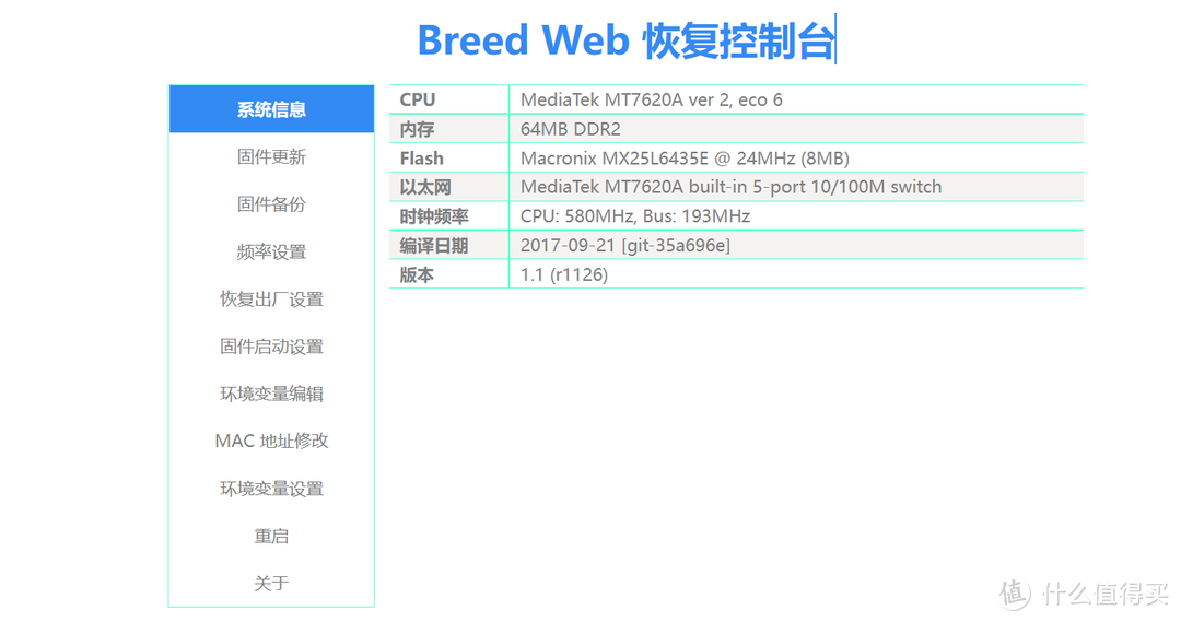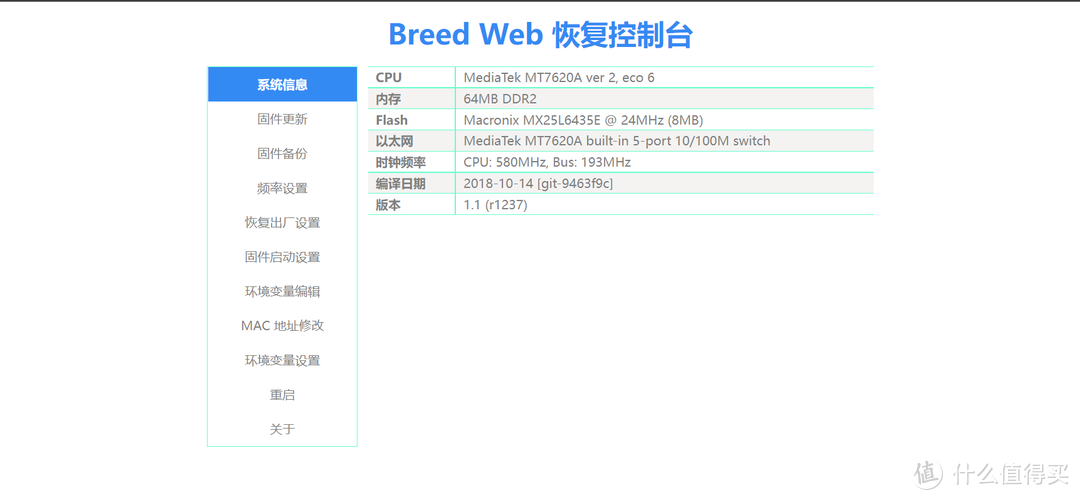 》》关于breed,简单来说其实就是我们以前玩安卓手机的REC模式,路由器在刷入breed以后,就可以通过breed刷如第三方固件。而且breed又被广大网友戏称“不死固件”,是因为刷入路由器刷入breed以后,之后我们刷的第三方固件全部是在 breed 里面完成,然后我们可以随意折腾也不用担心路由器“变砖”而无法使用,就算你刷错固件路由器没反应,我们也可以重新进入breed刷入一个可以启动的固件就可以了。