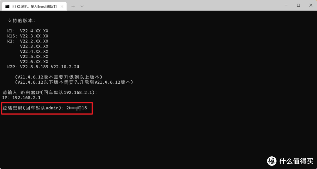 然后在输入路由器的登录密码(也就是你路由器的管理页面登录密码)。如果你的K2路由器是没有设置的,直接回车输入Y即可,程序会自动配置管理页面,这个时候管理密码会被配置为:tbvv.net。
